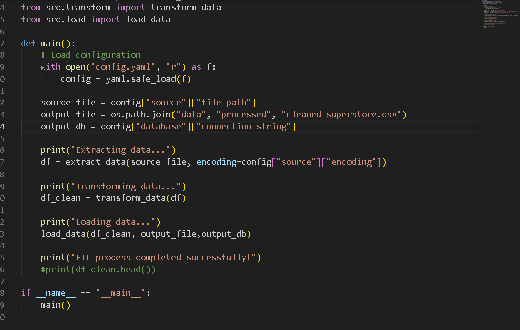 # Superstore ETL Pipeline This project is a Python-based ETL (Extract, Transform, Load) pipeline for processing Superstore sales data. It takes raw sales data in CSV format, cleans and standardizes it, and outputs the processed data to both a cleaned CSV file and an SQLite database. ## Project Structure ```text superstore_etl/ āāā main.py # Main execution script to run the ETL pipeline āāā config.yaml # Configuration file with source and database paths āāā notebooks/ # Directory for Jupyter notebooks (e.g., data exploration) āāā data/ ā āāā source/ # Raw source data (e.g., Sample - Superstore.csv) ā āāā processed/ # Processed outputs (cleaned CSV, SQLite DB) āāā src/ āāā extract.py # Data extraction logic (reads CSV) āāā transform.py # Data cleaning, imputation, and transformation logic āāā load.py # Logic to load data into CSV and SQLite ``` ## How It Works 1. **Extract (`src/extract.py`)**: Reads the raw CSV data from the path specified in `config.yaml` using the configured encoding. 2. **Transform (`src/transform.py`)**: Cleans the data by: - Handling and imputing missing values with "Unknown" or `0`. - Removing duplicate records. - Casting date columns (`Order Date`, `Ship Date`) to correct datetime formats. - Trimming whitespace and standardizing string formats (Title Casing). - Validating numeric columns (`Sales`, `Quantity`), filtering out strictly non-positive values. - Standardizing column names (lowercase with underscores) to prepare them for a database insertion. 3. **Load (`src/load.py`)**: Exports the cleaned `pandas` DataFrame to a processed CSV file and loads it into an SQLite database (`cleaned_superstore` table) specified in the config. ## Setup and Installation 1. Ensure you have Python installed. 2. Install the necessary dependencies: ```bash pip install pandas pyyaml ``` 3. Place the raw data file into the appropriate directory as specified in `config.yaml` (e.g., `data/source/Sample - Superstore.csv`). ## Usage To run the full ETL pipeline, simply execute the `main.py` script: ```bash python main.py ``` This will read the configuration, perform the data extraction, transformation, and load processes, and output success and completion messages to the console.