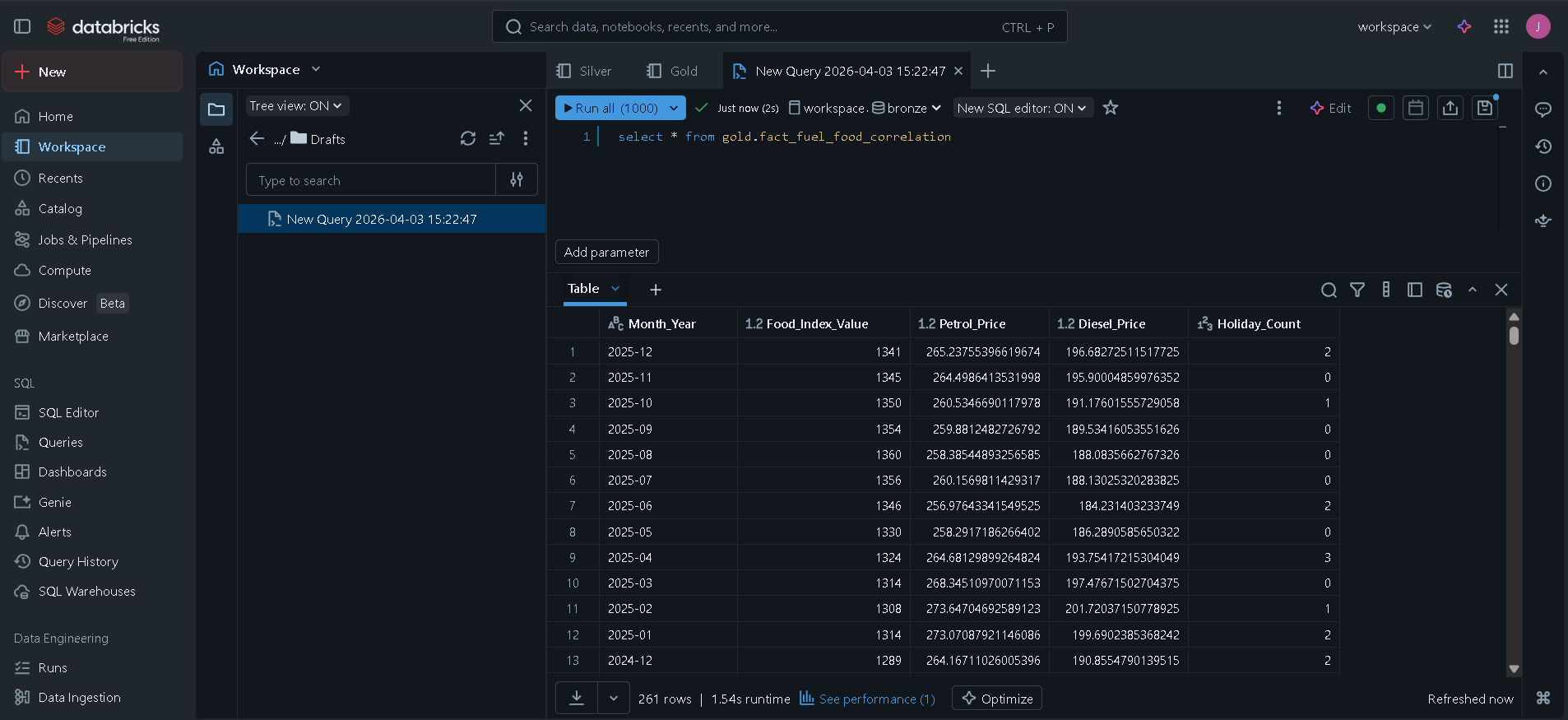 š NZ Fuel & Food Price Correlation Pipeline š Project Overview This project is a Data Engineering Pipeline built in Databricks to analyze the economic relationship between gasoline price fluctuations and the Food Price Index (FPI) in New Zealand. The goal was to determine if spikes in fuel (specifically Diesel and Regular Petrol) directly correlate with rising food costs, and to identify any "time-lags" in this relationship. šļø Architecture: The Medallion Approach The pipeline follows the Medallion Architecture to ensure data quality and scalability: Bronze Layer: Raw ingestion of Stats NZ and Fuel Price CSV files into Delta tables. Silver Layer: * Data cleaning and type casting. Feature Engineering: Created a custom dim_date table using the Python holidays library to flag New Zealand public holidays. Aggregation: Downsampled daily fuel prices to a monthly mean to match the Food Price Index grain. Gold Layer: * Implemented a Star Schema design. Created a fact_fuel_food_correlation table by joining processed fuel, food, and date dimension data. š ļø Tech Stack Platform: Databricks (Community Edition) Language: PySpark (Python) and Spark SQL Storage: Delta Lake Orchestration: Logic designed for integration with Airflow/Databricks Workflows Libraries: pandas, pyspark.sql.functions, holidays š Key Features & Logic Movable Holiday Logic: Automated detection of NZ-specific holidays (like Matariki and Easter) using the holidays library to account for seasonal price anomalies. Data Normalization: Transformed the "1960M01" date format into standard SQL timestamps for seamless joining. Business Intelligence Ready: The Gold layer is optimized for PowerBI/Tableau, pivoting fuel types into individual columns for immediate correlation analysis. š Repository Structure Bronze/: Notebooks for raw data ingestion. Silver/: Transformation logic and Dimension table creation. Gold/: Final Star Schema modeling and join logic. SourceData/: Sample CSV datasets used in the pipeline.
